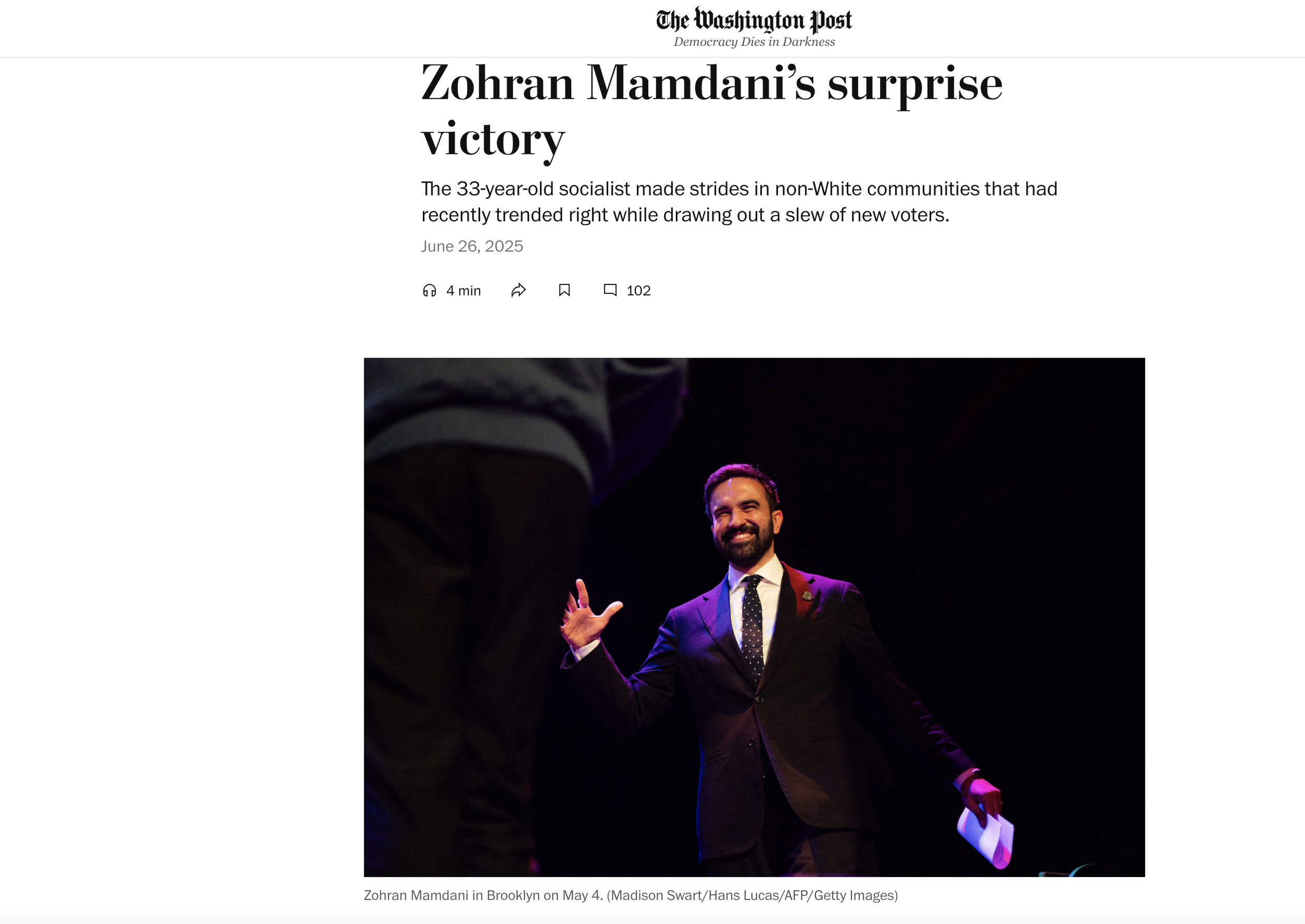 Huffpost - “AOC Endorses Socialist Upstart Zohran Mamdani For NYC Mayor” - June 2025 (Photo by Madison Swart for Hans Lucas/AFP for Getty Images)
